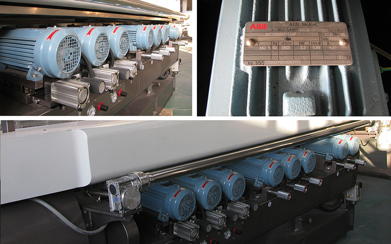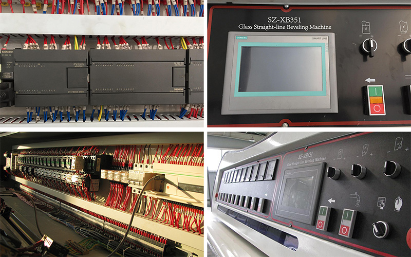 SZ-XB351 is designed for beveling and side edging of glass sheet with various size and thickness. The rough grinding, fine grinding as long as polishing are able to finished at one time, the processing speed is adjusted by variator which offers a wide range of speed selection; input and output conveyors adopt timing belt which can improve the stability of transmission; the grind wheel are indirectly connected to the motor to reduce vibrating; PLC and digital display are available for optional.