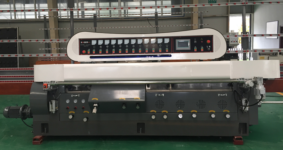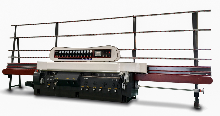 SZ-ZB11 Glass Straight-line Edging Machine is suitable for processing straight-line edge & 45° arris on glass. Rough, fine grinding and polishing on glass flat edge and arrises can be finished at one time. Input and output conveyors adopt timing belt which improves the stability of transmission. Spindles totally: 5 for the straight-line edge, 3 for front arris and 3 for back arris. Digital display for both thickness and speed.