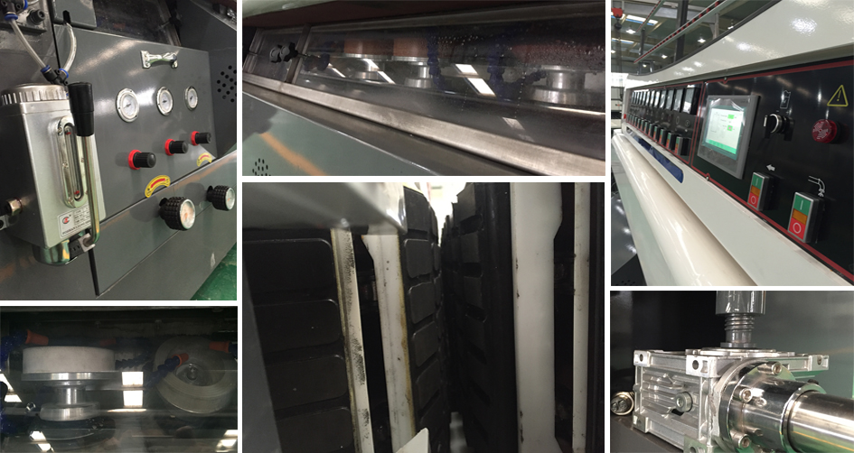 SZ-ZB9 is a perfect design for straight-line edging and arising, it is available with various size and thickness. The machine is equipped with 9 spindles, where 5 spindles for the edging and 4 arrissing; glass thickness is adjusted by a motor with digital display. A special design on the in-feed section, for which is able to control the desired value of feeding integrally, so that unnecessary to adjust each spindle individually. The independent felt wheel and the cerium water recirculation system make the flat edge more shining; Input and output conveyor adopt timing belt which can improve the transmission precision.