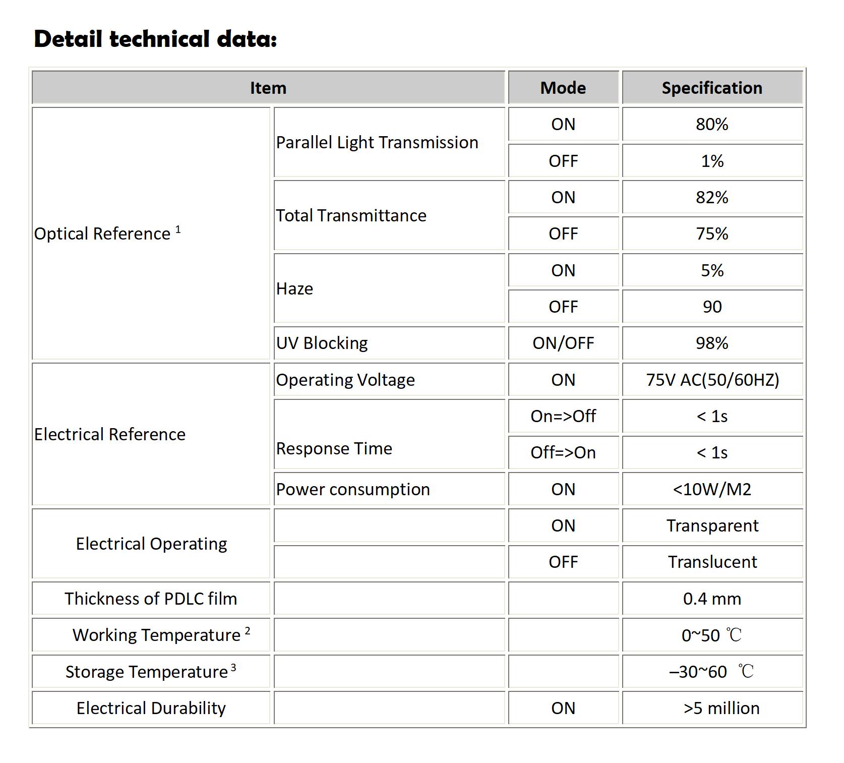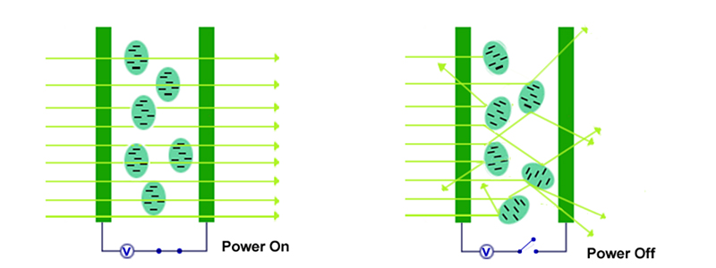 PDLC (Polymer Dispersed Liquid Crystal) film is a light modulating material comprised of droplets of liquid crystal uniformly dispersed in a transparency or translucency, flexible plastic film. When power off, coming visible light scatters through the PDLC, and the film turns translucent; When power on, coming visible light transmits the PDLC and the Film turns clear